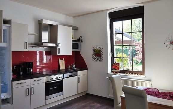 Küche komplett eingerichtet: Mikrowelle, Geschirrspüler, Kaffeemaschiene, Wasserkocher, Toaster, Küklschrank mit Tiefkühlfach, Mixer